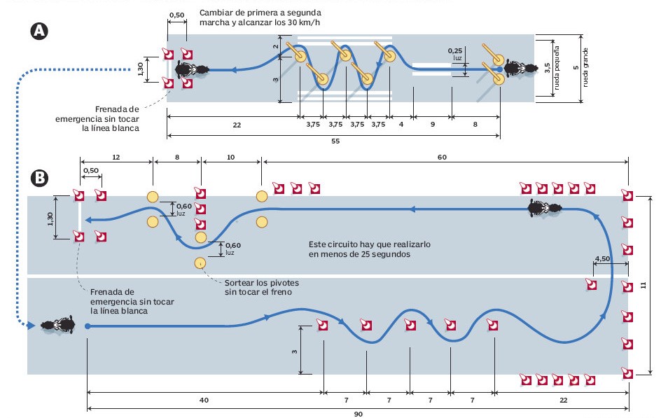 L’alumne ha de realitzar dos tipus de proves de destresa superant obstacles i cons: